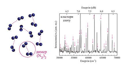 Виявлення молекулярних димерів (N2)2 у кластерах N2 та Ar-N2 [Phys. Rev. A 84, No. 2, 023201 (2011)].