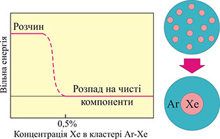 ● Виявлено фазове розшарування на чисті компоненти в кластерах Ar-Xe (у масивних