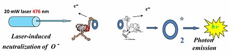 In rare gas solids doped with oxygen О- ions are formed under electron beam. Ions are neutralized by laser light. Thermally stimulated diffusion of oxygen atoms and their recombination lead to formation of excited molecules О2* emitting photons. This internal light source stimulates relaxation processes: luminescence of matrix, electron emission from the crystal surface and desorption of own particles.