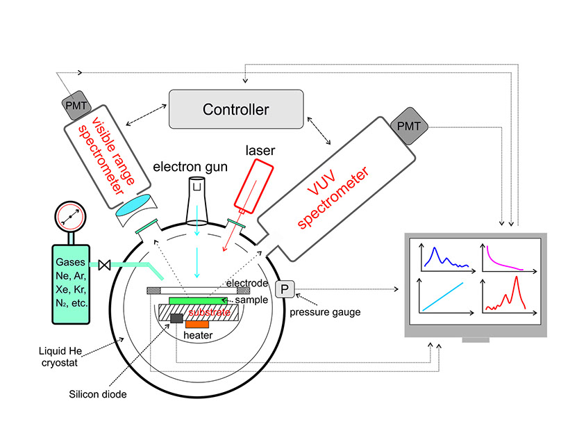 The spectral multifunctional complex can be applied for study of electronic structure, dynamics and relaxation processes of cryogenic materials as well as of wide variety of new prospective materials and composites. It is especially suitable for study of radiation effects, stability of radiation-induced centers and defect-level analysis. Application of the developed new methods – nonstationary luminescence (NsL) and nonstationary desorption (NsD), permits to reveal contribution of charged states in radiation-induced processes. Essential advantage of the spectral multifunctional complex is its capability to detect all relaxation emission from the same sample in correlated manner which ensures obtaining of reliable results.