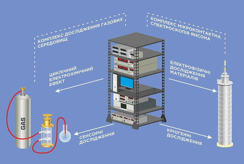 Дослідницький комплекс включає кріогенну систему, вакуумну систему, пристрої для створення нанорозмірних точкових контактів та точково-контактних наносенсорів, автоматизований мікроконтактний спектрометр, оригінальне програмне забезпечення.